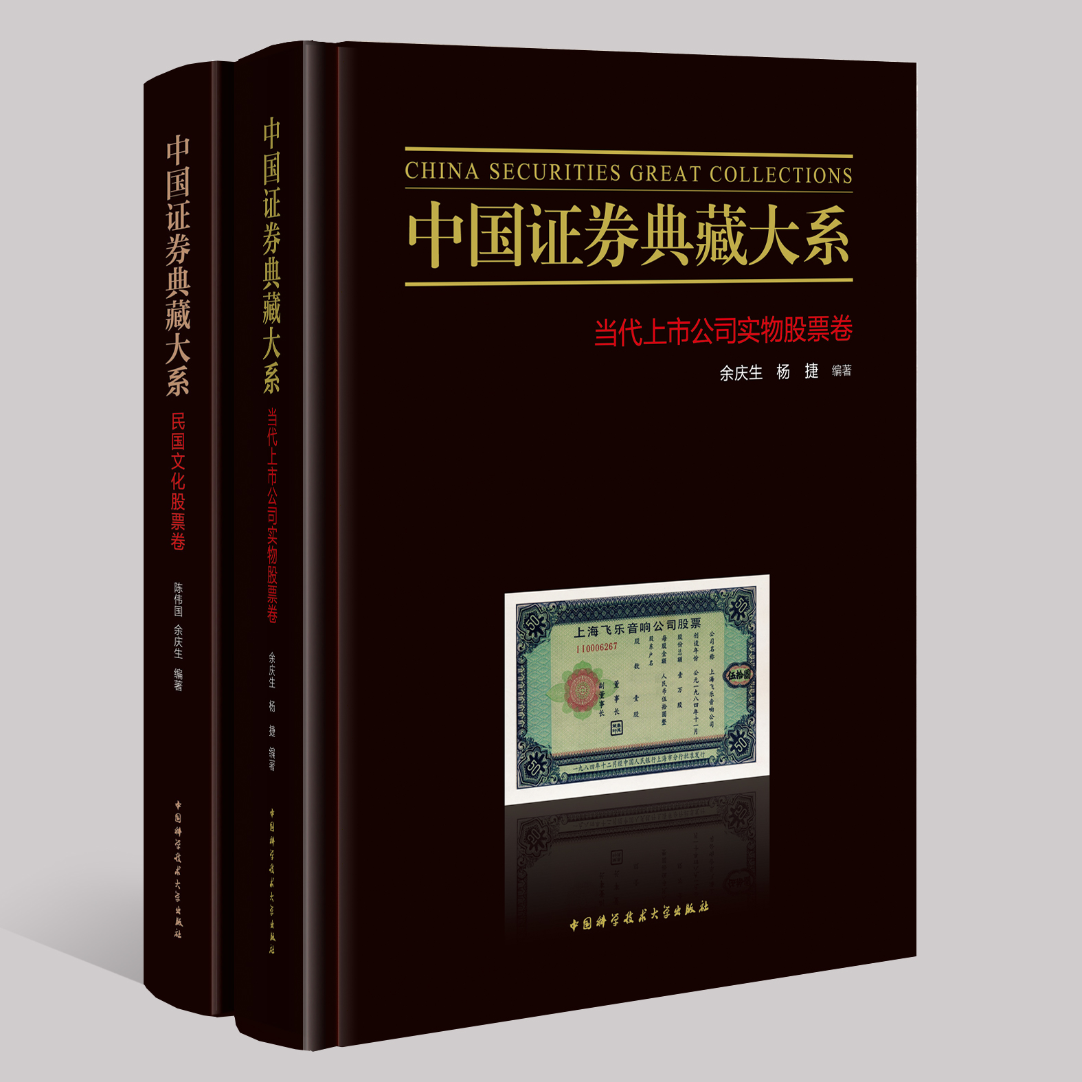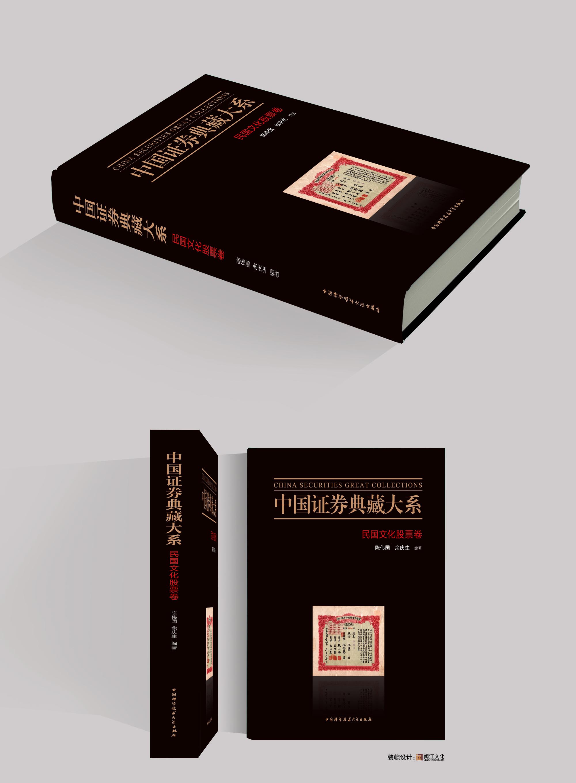 閏江文化裝幀設(shè)計(jì)的新書《中國(guó)證券典藏大系》《民國(guó)文化卷》和《當(dāng)代上市公司實(shí)物股票卷》由中國(guó)科學(xué)技術(shù)大學(xué)出版社出版發(fā)行